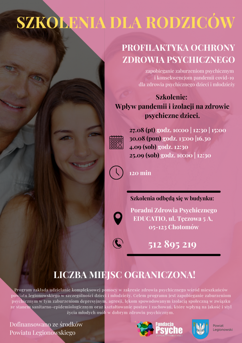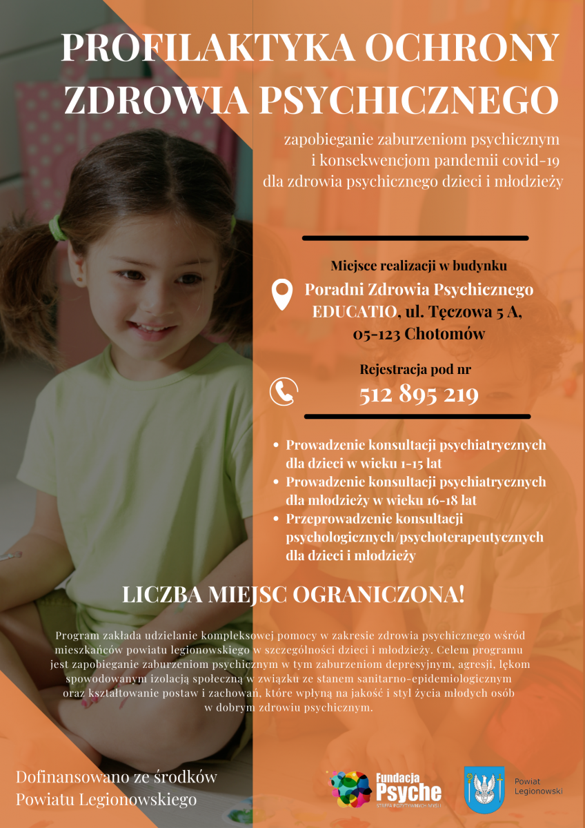 Trwa akcja Profilaktyka ochrony zdrowia psychicznego - zapobieganie zaburzeniom psychicznym i konsekwencjom pandemii COVID-19 dla zdrowia psychicznego dzieci i młodzieży, zakładająca udzielanie kompleksowej pomocy w zakresie zdrowia psychicznego wśród mieszkańców powiatu legionowskiego, w szczególności dzieci i młodzieży. Jej celem jest przeciwdziałanie zaburzeniom psychicznym, w tym zaburzeniom depresyjnym, agresji, lękom spowodowanym izolacją społeczną oraz kształtowanie postaw i zachowań, które wpłyną na jakość i styl życia młodych osób. Propozycja jest skierowana do dzieci i młodzieży (1-18 lat), dając im możliwość skorzystania z darmowych konsultacji psychiatrycznych i psychoterapeutycznych.