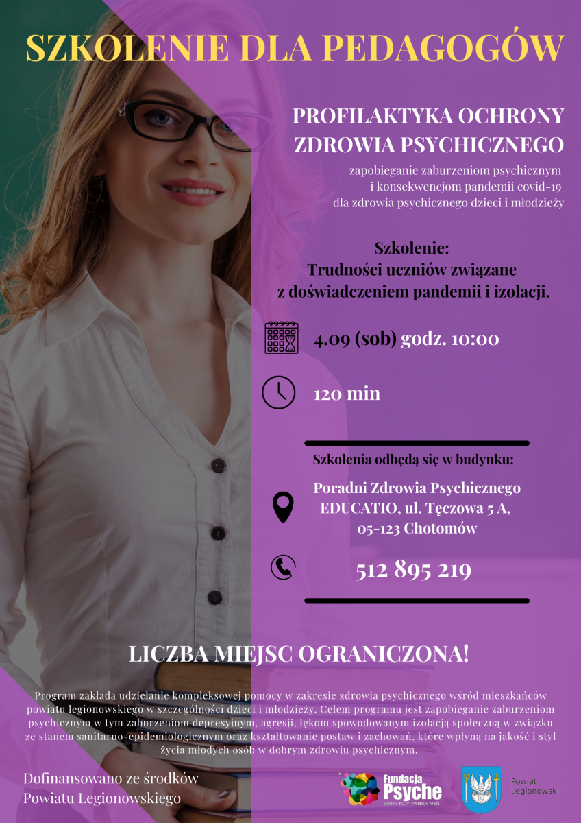 Zaplanowano także realizację szkolenia dla pedagogów szkolnych, zatrudnionych w szkołach podstawowych i ponadpodstawowych z terenu powiatu legionowskiego, z zakresu interwencji kryzysowych związanych z pandemią COVID-19. W efekcie zwiększeniu ulegnie świadomość pedagogów co do stanów emocjonalnych i psychicznych uczniów. Termin szkolenia 4 września.
