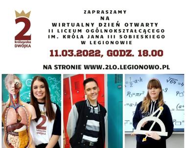 Dyrekcja i Grono Pedagogiczne II Liceum Ogólnokształcącego im. Króla Jana III Sobieskiego zaprasza na Wirtualny Dzień Otwarty, który odbędzie się w dniu 11 marca 2022 roku o godzinie 18:00 za pośrednictwem strony