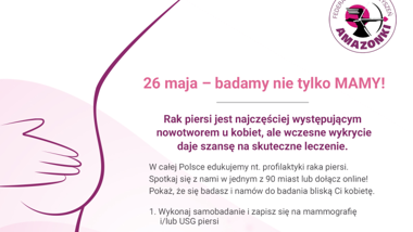 Legionowski Klub Amazonek przy Stowarzyszeniu Pomocy Potrzebującym Nadzieja jako jeden z 90. w Polsce włącza się w ogólnopolską akcję organizowaną przez Federację Stowarzyszeń Amazonki pod tytułem Badamy nie tylko mamy. Honorowy patronat nad akcją objęła Małżonka Prezydenta RP Agata Kornhauser-Duda.