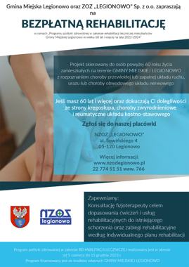 Zadnie dotyczy realizacji programu polityki zdrowotnej pn. Program polityki zdrowotnej w zakresie rehabilitacji leczniczej mieszkańców Gminy Miejskiej Legionowo w wieku 60 lat i więcej na lata 2022 - 2024” w roku 2023.