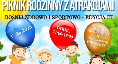 Zachęcamy do udziału w drugiej edycji pikniku Rodzinnego Rośnij Zdrowo i Sportowo, organozowany przez Koło Gospodyń Wiejskich w Chotomowie, który odbędzie się w sobotę, 17 czerwca br., w godz. 11-16, na ścieżce edukacyjnej w Chotomowie. Starosta Legionowski objął wydarzenie swoim patronatem.