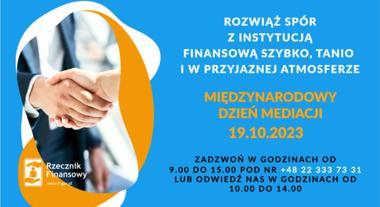 Z okazji obchodów Międzynarodowego Dnia Mediacji Rzecznik Finansowy oferuje pomoc ekspertów w rozwiązaniu sporu z instytucją finansową pod numerem telefonu 22 333 73 31 lub w biurach Rzecznika Finansowego w Warszawie, Olsztynie i Lublinie.