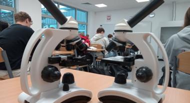 Na zdjęciu nowe mikroskopy w LO im. S. Lema w Stanisławowie Pierwszym